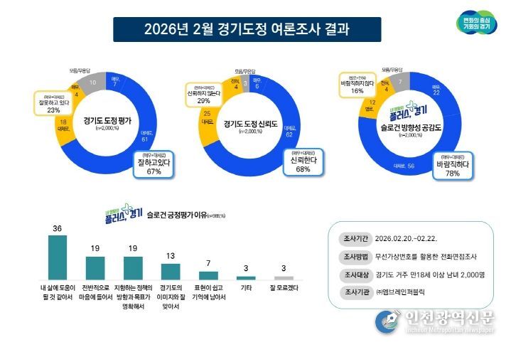 경기도가 ㈜엠브레인퍼블릭에 의뢰해 2월 20일부터 22일까지 실시한 정기 여론조사 결과, 경기도정에 대해 “잘하고 있다”는 응답은 67%, “잘못하고 있다”는 23%, “모름·무응답”은 10%였다.