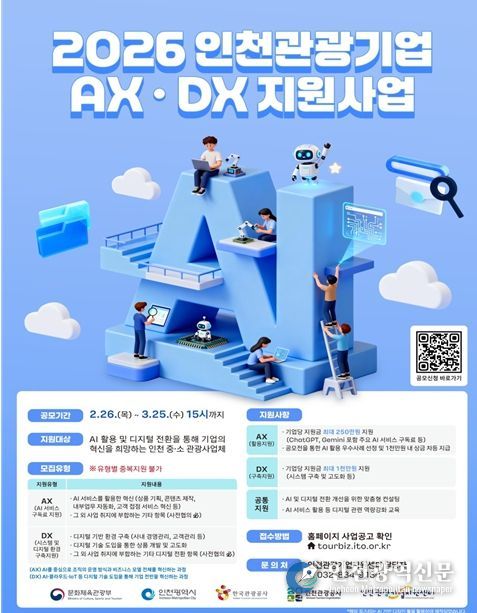[인천광역신문] 관리자 기자 | 인천광역시와 인천관광공사는 지역 관광기업의 혁신 역량 강화를 위해 ‘2026 인천 관광기업 인공지능 전환(AX)·디지털 전환(DX)’지원사업 참여기업을 오는 3월 25일까지 공모한다고 밝혔다.