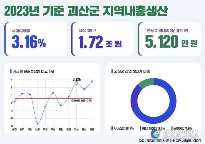 주민 체감 지표인 1인당 GRDP도 상승했다. 2023년 괴산군 1인당 GRDP는 5,120만 원으로 집계돼 음성·진천·단양군에 이어 도내 네 번째로 높았다.