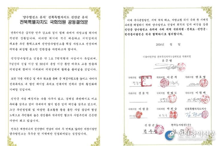진안군 관계자는 “양수발전소 유치는 진안군을 넘어 전북 전체의 미래 경쟁력과 직결된 과제”라며 “전북특별자치도와 지역 국회의원들이 함께 뜻을 모아 공동서명으로 이어졌다는 것은 전북이 하나의 팀으로 움직이고 있다는 상징적인 의미를 갖는다”고 밝혔다.