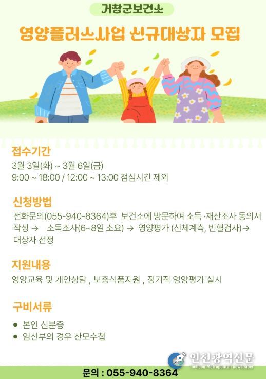 [인천광역신문] 관리자 기자 | 거창군은 임산부와 영유아의 영양 문제를 개선하기 위해 영양플러스사업 신규 대상자를 오는 3월 3일부터 6일까지 모집한다.