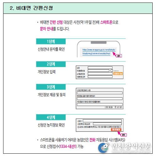 금년의 경우 신청 편의성 제고를 위해 스마트폰 등을 이용한 비대면 신청기한을 1개월에서 3개월로 확대했다. 신청일 기준으로 농업경영체 등록정보가 지난해와 변동이 없는 농업인은 비대면 간편신청이 가능하며, 별도의 서류 제출 없이 스마트폰이나 전화자동응답시스템(ARS)를 이용해 신청이 가능하다. 이들에게는 문자메시지(SMS) 등을 통해 3월 3일부터 신청을 안내할 예정이다. 또한, 간편신청이 불가한 농업인·법인은 인터넷에 접속하여 비대면 신청이 가능하도록 신청방식을 추가 도입하여 농업인들이 보다 편리하게 신청할 수 있게 했다.