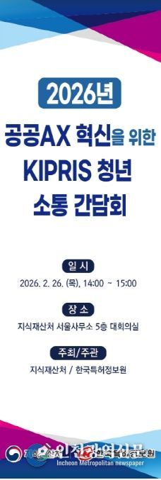 [인천광역신문] 관리자 기자 | 지식재산처는 2월 26일 14시, 한국지식재산센터(서울 강남구)에서 청년들의 참신한 시각을 통해 지식재산정보검색서비스(KIPRIS)의 발전 방향을 모색하는 'KIPRIS 청년 소통 간담회'를 개최한다고 밝혔다.