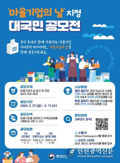 [인천광역신문] 관리자 기자 | 행정안전부는 ‘마을기업’에 대한 국민의 이해를 높이고 마을기업 활동을 활성화하기 위해 법정기념일인 ‘마을기업의 날’의 날짜와 의미를 국민이 직접 정하는 대국민 공모를 진행한다고 밝혔다.