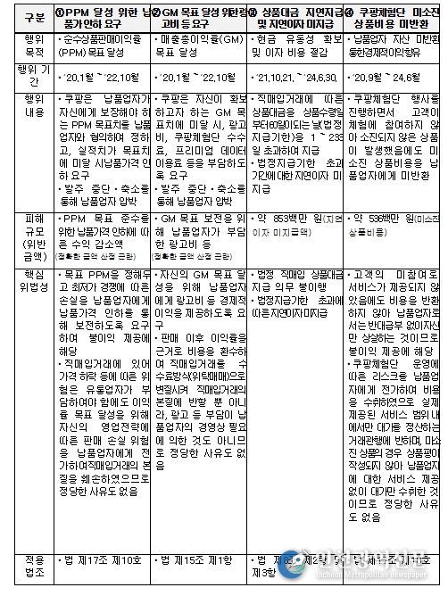 공정위는 PPM 목표 합의 및 목표 달성을 위한 납품단가 인하 요구행위와 쿠팡체험단 미소진 상품비용 미반환 행위는 '대규모유통업에서의 거래 공정화에 관한 법률'(이하 ‘법’) 제17조 제10호(불이익 제공 금지) 위반에 해당하고, GM 목표 달성을 위한 광고비 등 요구행위는 법 제15조(경제적 이익 제공 요구 금지) 위반에 해당하며, 상품대금 지연지급 및 지연이자 미지급 행위는 법 제8조(상품판매대금 등의 지급) 제2항 및 제3항 위반에 해당한다고 판단했다.