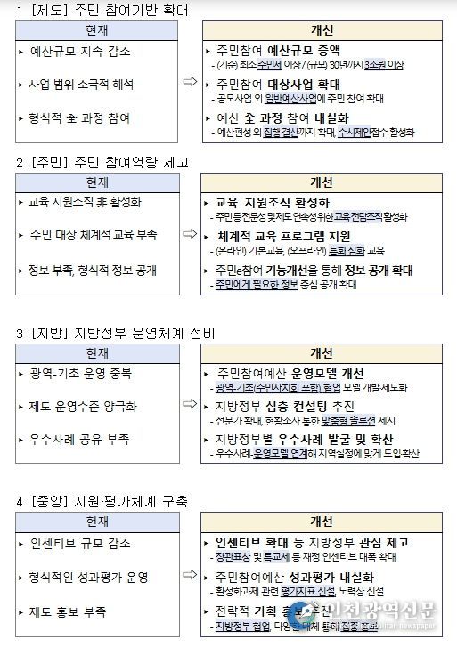 행정안전부는 주민참여예산제도가 현장에서 더욱 활성화되도록 주민, 전문가 등의 의견을 수렴해 다음과 같은 중점 추진 과제를 마련했다.