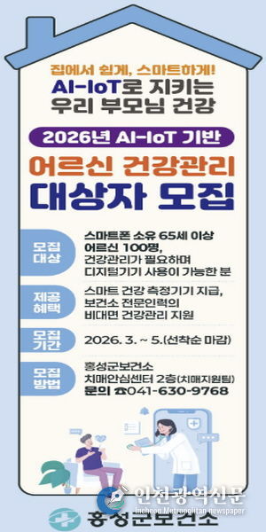 [인천광역신문] 관리자 기자 | 홍성군은 어르신 만성질환 예방과 건강한 노후 생활 지원을 위해 ‘2026년 AI·IoT 기반 어르신 건강관리사업’의 참여 대상자 100명을 모집한다고 밝혔다.