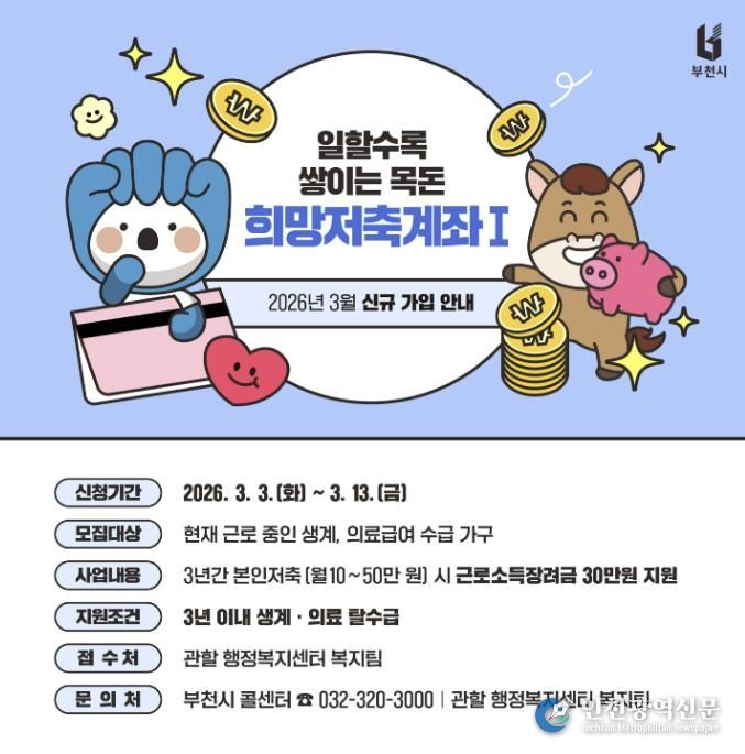 [인천광역신문] 관리자 기자 | 부천시는 근로 중인 생계·의료급여 수급 가구의 자산 형성과 자립을 지원하기 위해 ‘2026년 희망저축계좌(Ⅰ)’ 신규 가입자를 3월 3일부터 3월 13일까지 모집한다.