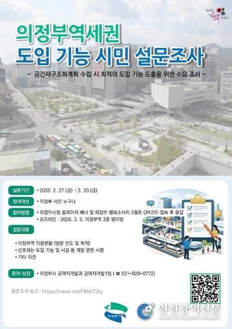 [인천광역신문] 관리자 기자 | 의정부시는 2월 27일부터 3월 20일까지 의정부역세권 개발 시 도입 기능에 대한 시민 설문조사를 진행한다.