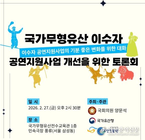 [인천광역신문] 관리자 기자 | 국가유산청은 양문석 국회의원, 국가유산진흥원과 함께 2월 27일 오후 2시 30분, 국가무형유산전수교육관 민속극장 풍류(서울 강남구)에서 '국가무형유산 이수자 공연 지원 사업 개선을 위한 토론회'를 공동 개최한다.