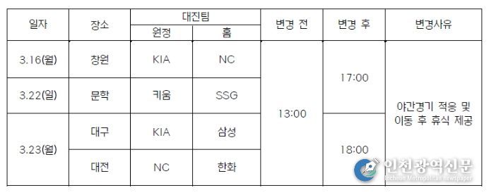 [인천광역신문] 관리자 기자 | 2026 KBO 시범경기 중 일부 경기의 개시 시간이 야간경기 적응 및 이동 후 휴식 제공을 위해 변경됐다.