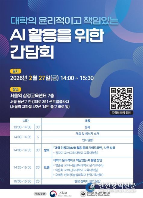 [인천광역신문] 관리자 기자 | 교육부와 한국대학교육협의회(회장 양오봉)는 2월 27일, 서울역 삼경교육센터에서 ‘대학 인공지능(AI) 활용 윤리 지침(가이드라인) 마련을 위한 간담회’를 개최한다.