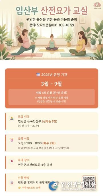 [인천광역신문] 관리자 기자 | 연천군보건의료원은 저출생 위기 극복과 관내 임산부들의 건강한 출산을 돕기 위해 오는 3월부터 ‘2026년 임산부 산전요가 교실’을 본격적으로 운영한다고 밝혔다.