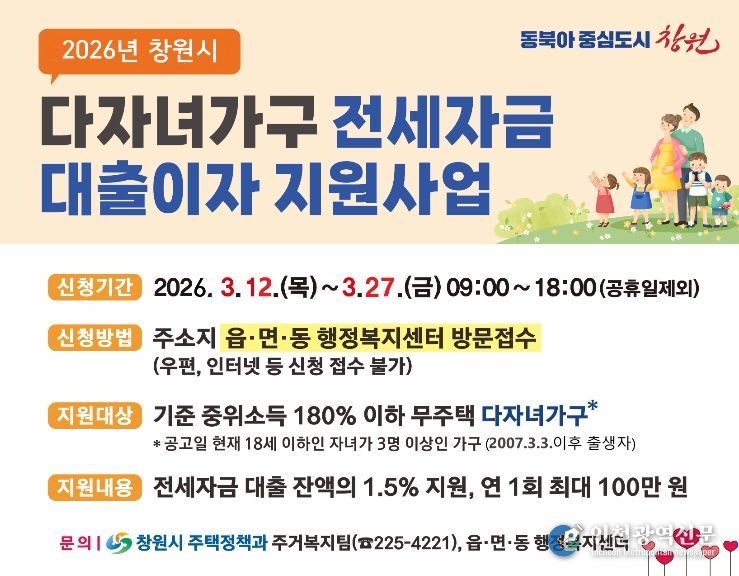 [인천광역신문] 관리자 기자 | 창원특례시는 세자녀 이상 다자녀가구의 전세자금 대출에 대한 이자 부담을 줄이고 안정적인 주거환경을 조성하기 위해 “창원시 다자녀가구 전세자금 대출이자 지원사업”을 시행한다고 밝혔다.
