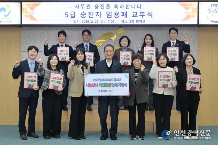 [인천광역신문] 관리자 기자 | 울산 남구는 5급 승진리더과정 교육에서 복귀한 승진임용 사무관 12명이 관내 위기가정 지원을 위해 나눔천사‘착한출발(매월 1만원 이상 정기기부)’가입에 함께 동참했다고 밝혔다.
