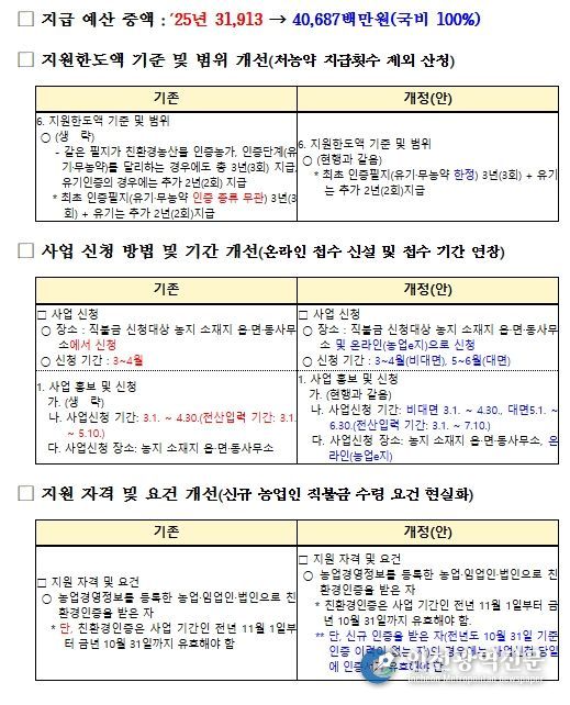 그동안 친환경직불금 지급횟수 산정 시 저농약인증(’16년 폐지) 지급 이력이 포함되어 일부 농가의 직불 참여 기회가 제한되고 신규 인증농가의 직불금 신청 요건이 현실에 맞지 않다는 등의 현장 의견이 제기되어 왔다.