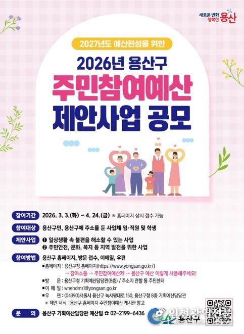 [인천광역신문] 관리자 기자 | 서울 용산구가 4월 24일까지 2027년 예산에 반영할 주민참여예산 사업을 공모한다. 생활안전, 문화, 복지 등 주민 생활과 밀접한 분야를 대상으로, 총규모는 10억 원이다.