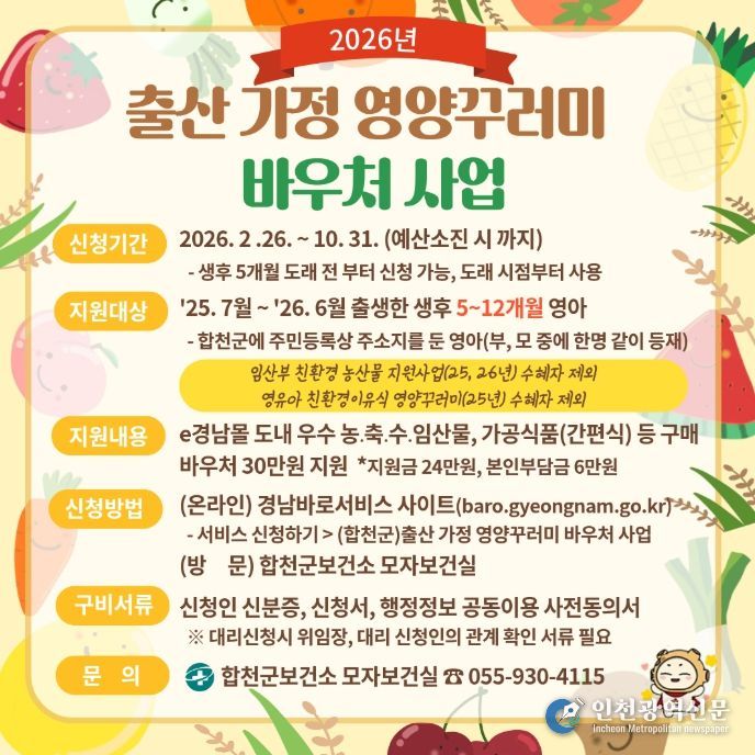 [인천광역신문] 관리자 기자 | 합천군은 영아의 건강한 성장과 발달을 돕고 출산 가정의 경제적 부담을 완화하기 위해 ‘출산가정 영양꾸러미 바우처 지원사업’을 2월 27일부터 시행하고 있다.