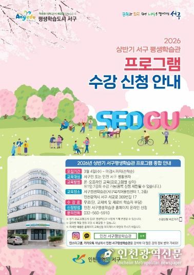 [인천광역신문] 관리자 기자 | 인천 서구는 오는 4일부터 ‘2026년 상반기 서구평생학습관 정기강좌’ 학습자를 모집한다고 밝혔다.