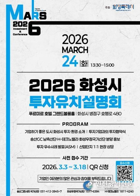 [인천광역신문] 관리자 기자 | 화성특례시가 오는 3월 24일 푸르미르 호텔에서 ‘2026 화성특례시 투자유치 설명회’를 개최하고, 3월 3일부터 3월 18일까지 QR코드를 통한 사전접수를 진행한다.