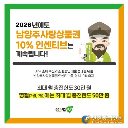 [인천광역신문] 관리자 기자 | 남양주시는 ‘남양주사랑상품권’ 인센티브 10% 정책을 올해도 변함없이 이어간다고 3일 밝혔다.