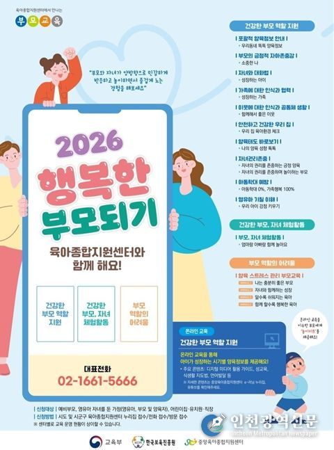 [인천광역신문] 관리자 기자 | 교육부는 중앙육아종합지원센터(센터장 조용남) 및 시도·시군구 육아종합지원센터와 협력하여 '2026년 공통 부모교육 사업'을 3월부터 연중 지속 운영한다고 밝혔다.