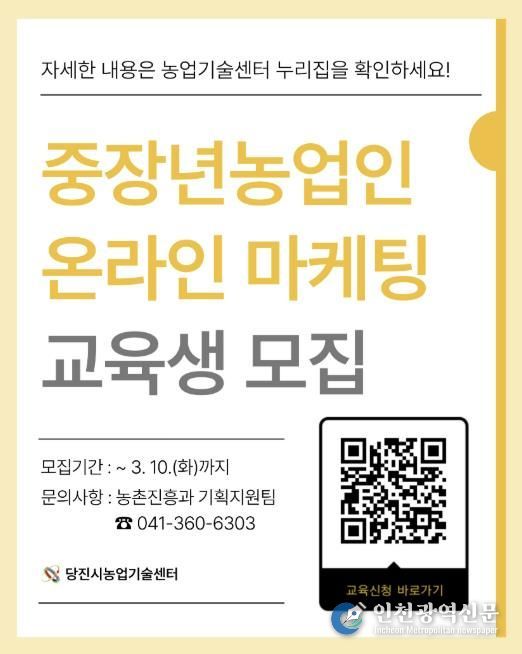 [인천광역신문] 관리자 기자 | 당진시는 농산물 온라인 판로 확대와 디지털 역량 강화를 위해 ‘중장년농업인 온라인 마케팅 교육’ 교육생을 모집한다고 4일 밝혔다.