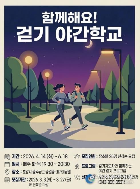 [인천광역신문] 관리자 기자 | 충주시는 시민들의 신체활동 참여를 확대하고 올바른 걷기 문화를 확산하기 위해 ‘2026년 상반기 걷기 야간학교’를 운영한다고 4일 밝혔다.