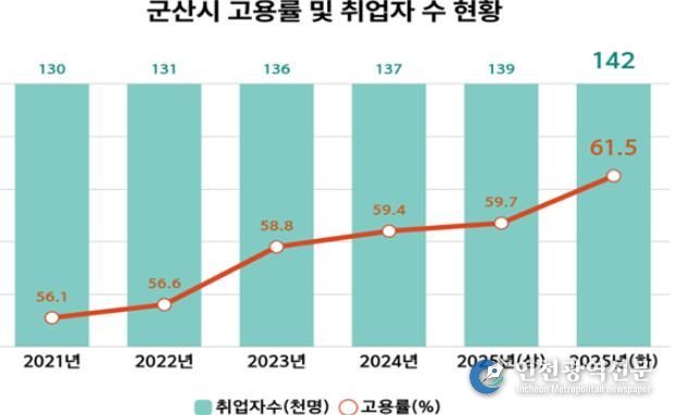 지난달 24일 통계청 ‘지역별 고용조사’에 따르면, 군산시 2025년 하반기 고용률은 작년 하반기 대비 2.1%p 상승했으며, 취업자 수는 작년 하반기와 비교해 5,000명이나 증가하여 14만 2,000명을 기록했다.