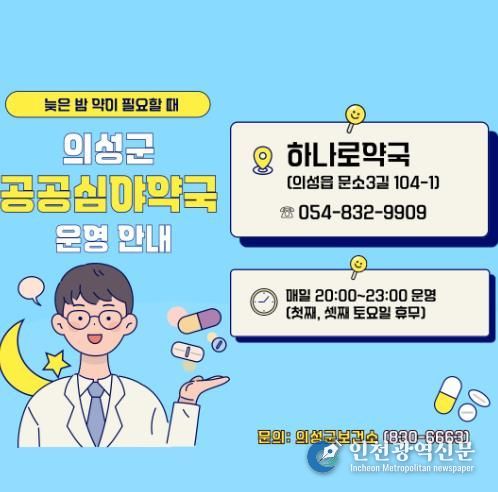 [인천광역신문] 관리자 기자 | 의성군은 군민들이 늦은 밤에도 안전하게 의약품을 구입하고 전문적인 복약 상담을 받을 수 있도록 지난해에 이어 2026년에도 공공심야약국을 지속 운영한다고 밝혔다.