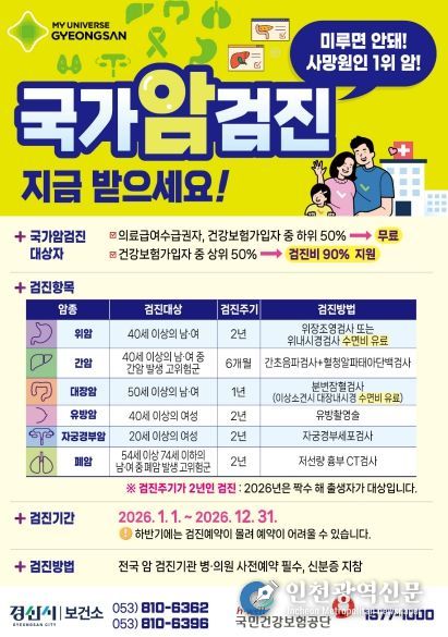 [인천광역신문] 관리자 기자 | 경산시는 시민들의 활기찬 한 해를 지원하기 위해 2026년도 국가건강검진 수검을 적극 권고하고 나섰다. 흔히 건강 관리 목표로 운동이나 식단 관리를 꼽지만, 본인의 현재 몸 상태를 정확히 파악하는 ‘건강검진’이야말로 건강 관리의 첫 시작이다.