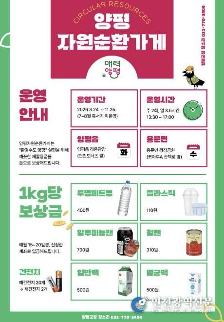 [인천광역신문] 관리자 기자 | 양평군은 고품질 재활용 가능 자원의 올바른 분리·배출을 유도하고, 유가 보상 혜택을 제공하는 생활밀착형 자원순환 거점공간 ‘양평 자원순환가게’를 오는 24일부터 운영한다고 밝혔다.