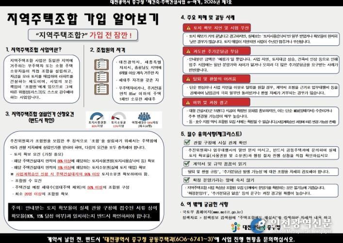 이에 중구는 지역주택조합사업의 이해와 조합원 가입 시 유의사항을 알기 쉽도록 안내문을 제작하여 중구 홈페이지, 관내 행정복지센터 게시판 게재 및 공동주택단지 등에 배포를 완료했다.