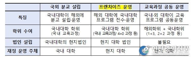 교육부는 그간 대학의 해외 진출을 지원하기 위해 관련 규제를 정비해 왔다. 기존의 사전 승인 중심 운영체계를 개편하여 대학 간 협약을 기반으로 프랜차이즈 운영이 가능하도록 개선하고, 교육과정 구성과 수업 운영은 대학 자율로 정하도록 하여 실행력을 높였다. 이번 사례는 이러한 제도 개선의 결실이며, 국립대학으로는 첫 번째이다.
