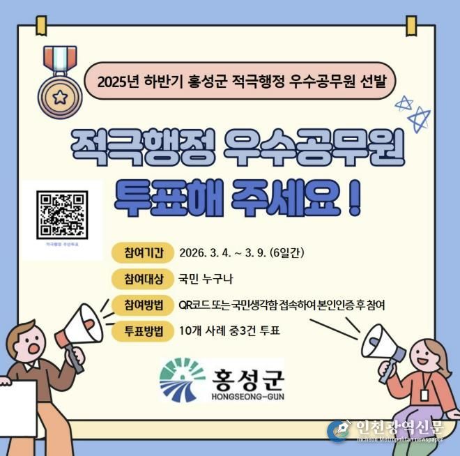 [인천광역신문] 관리자 기자 | 홍성군이 ‘2025년 하반기 적극행정 우수공무원 선발’을 위해 오는 9일까지 국민권익위원회 ‘국민생각함’ 플랫폼에서 온라인 주민 투표를 진행한다. 부서·직원·국민 추천을 통해 선정된 적극행정 우수사례를 대상으로 지역과 관계없이 누구나 참여할 수 있다.
