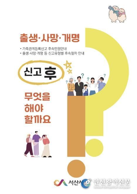 [인천광역신문] 관리자 기자 | 충남 서산시는 가족관계등록신고에 대한 후속민원을 한눈에 알아볼 수 있도록 ‘출생ㆍ사망ㆍ개명 신고 후 무엇을 해야 할까요?’ 책자를 발간했다고 밝혔다.