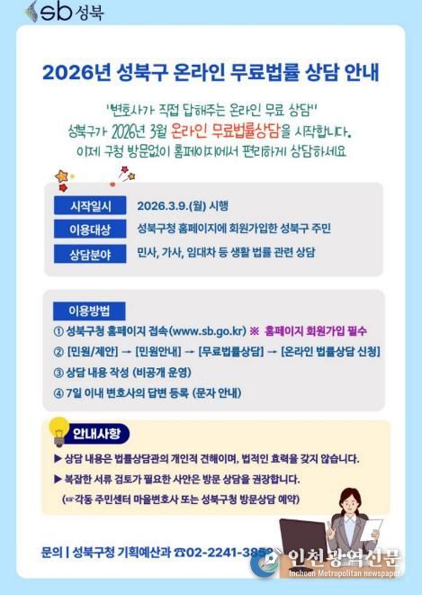 [인천광역신문] 관리자 기자 | 서울 성북구가 오는 9일부터 구민의 법률 고민을 신속하고 편리하게 해결하기 위한 ‘온라인 무료법률상담’ 서비스를 정식 운영한다.