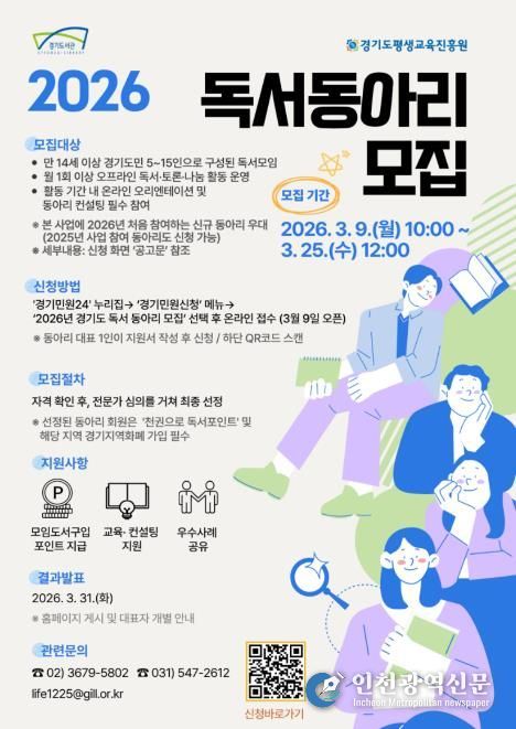 [인천광역신문] 관리자 기자 | 경기도는 도민의 자발적 독서 활동을 지원하고 책 읽는 문화를 확산시키기 위해 9일부터 25일까지 ‘2026년 경기도 독서동아리’ 400곳을 모집한다.