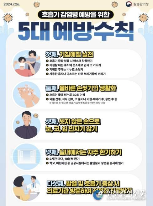 또한 ▲인플루엔자 예방접종 ▲기침예절 실천 ▲올바른 손씻기 생활화 ▲씻지 않은 손으로 눈·코·입 만지지 않기 ▲실내 자주 환기하기 ▲발열 및 호흡기 증상 시 의료기관 방문 등 호흡기 감염병 예방수칙을 철저히 지켜 줄 것을 강조했다.