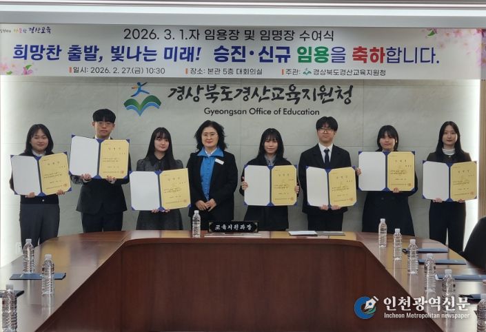 [인천광역신문] 관리자 기자 | 경산교육지원청은 2월 27일 경산교육지원청 본관 5층 대회의실에서 신규교감 8명, 신규교사 7명에게 임용장 및 임명장을 수여했다.