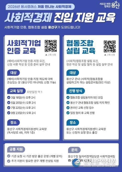 [인천광역신문] 관리자 기자 | 서울 용산구는 사회적경제 진입을 희망하는 구민을 대상으로 ‘용사클래스–처음 만나는 사회적경제’를 운영한다.