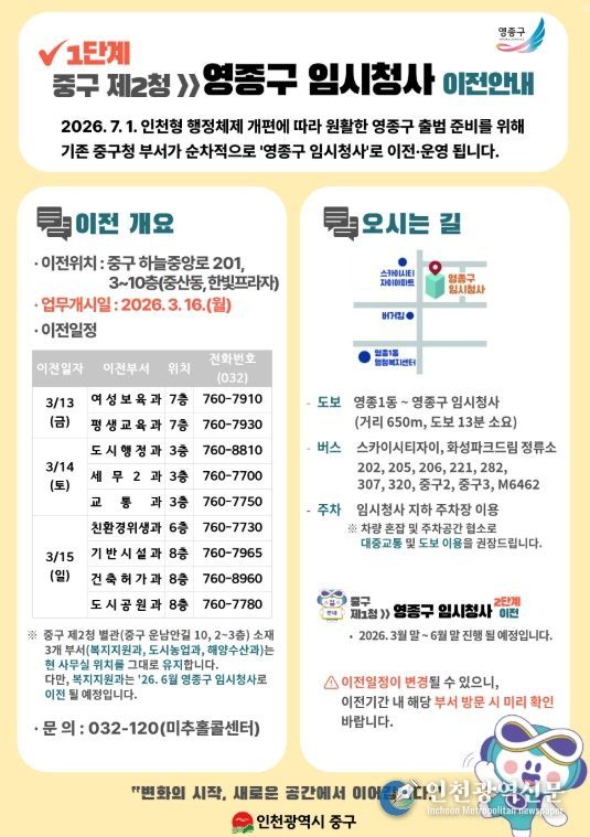 [인천광역신문] 관리자 기자 | 인천시 중구는 영종구 출범을 앞두고, 원활한 영종구 임시청사 개청 준비를 위해 순차적인 부서 이전을 추진한다고 5일 밝혔다.