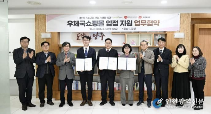 [인천광역신문] 관리자 기자 | 양주시가 지난 4일 한국우편사업진흥원, 양주우체국과 함께 관내 중소기업의 온라인 유통망 확대를 위한 ‘우체국 입점 지원 업무협약’을 체결했다.