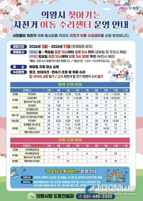 [인천광역신문] 관리자 기자 | 의왕시가 시민들의 자전거 이용 활성화와 안전한 자전거 문화 확산을 위해 '2026년 찾아가는 자전거 이동 수리센터'를 운영한다.