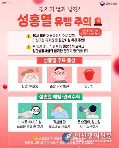 [인천광역신문] 관리자 기자 | 대구 북구보건소는 봄철 개학기를 맞아 아동 및 청소년층에서 발생이 증가하는 제2급 법정감염병 ‘성홍열(Scarlet Fever)’에 대해 3월 감염병 사전예보를 발령하고 주민들의 각별한 주의를 당부했다.