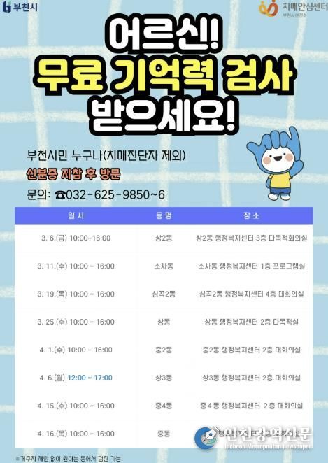 [인천광역신문] 관리자 기자 | 부천시는 치매 조기 발견과 중증화 예방을 위해 3월 6일부터 4월 16일까지 ‘2026년 상반기 찾아가는 치매조기검진(동별검진)’을 실시한다.