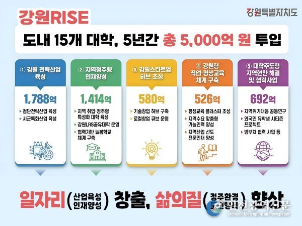 - 도는 ▲강원 전략산업 육성 1,788억 원 ▲지역 정주형 인재양성 1,414억 원 ▲강원 스타트업 허브 조성 580억 원 ▲강원형 직업‧평생교육 체계 구축 526억 원 ▲대학주도형 지역현안해결 및 협력사업 692억 원 등 5대 프로젝트를 중심으로 강원형 지역혁신 모델 구축을 추진하고 있다.