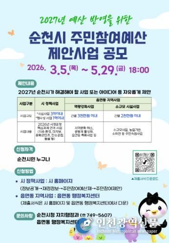 [인천광역신문] 관리자 기자 | 순천시는 2027년도 예산편성 과정에 시민의 다양한 의견과 아이디어를 반영하기 위해 3월부터 5월까지 주민참여예산 제안사업을 접수한다고 밝혔다.