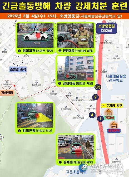 [인천광역신문] 관리자 기자 | 서울특별시 소방재난본부는 4일 서대문구 홍제동 소재 명예 도로명인 소방영웅길 일대에서 소방차 출동로 확보와 신속한 현장 대응력 강화를 위한 ‘긴급출동 방해 차량 강제처분’에 대한 공개 훈련을 진행했다고 밝혔다.