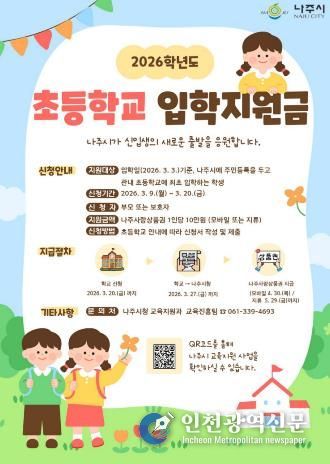 나주시는 2026년 초등학교 입학일인 3월 3일 기준 나주시에 주민등록을 두고 계속 거주하면서 관내 초등학교에 최초 입학하는 신입생을 대상으로 입학지원금을 지원한다고 5일 밝혔다.